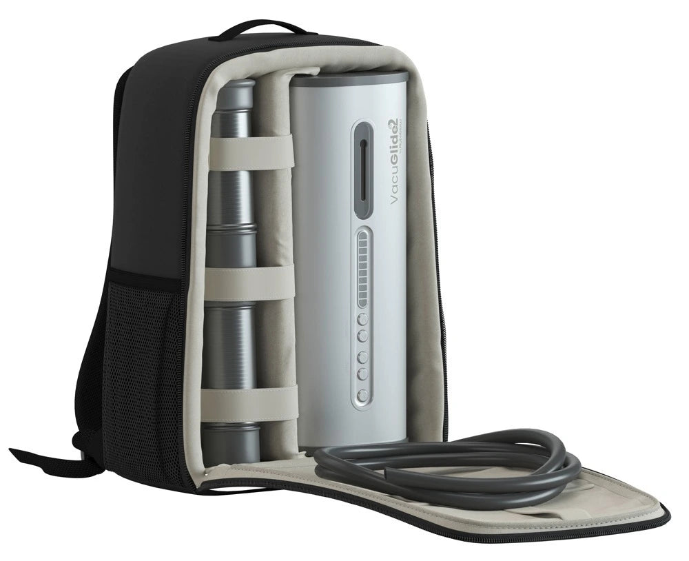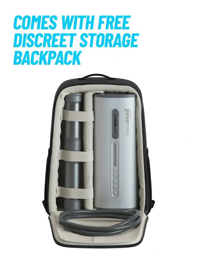 - Lieferumfang: 1 VacuGlide 2 Gerät, 3 Zylinder (verschiedene Größen), 3 Silikon-Sleeves, Netzkabel, Aufbewahrungs-Tragetasche, Bedienungsanleitung